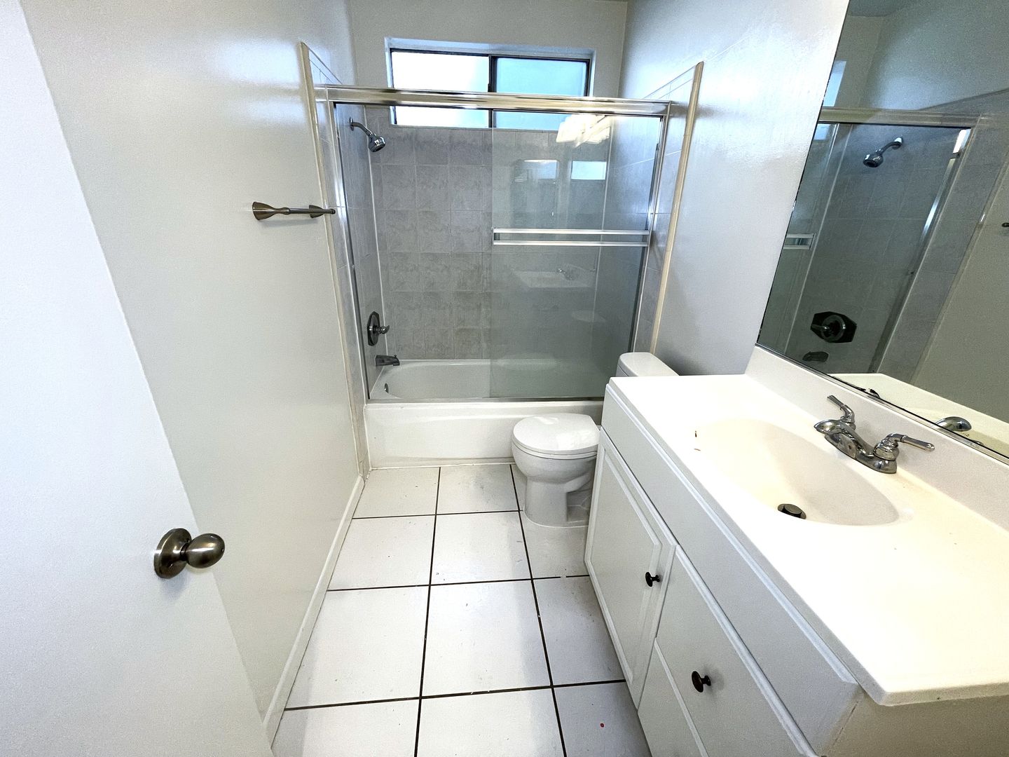 -- Remodeled bathroom includes tile flooring and tiled shower/bath, glass shower doors, granite countertops, refinished cabinetry and stylish fixtures
