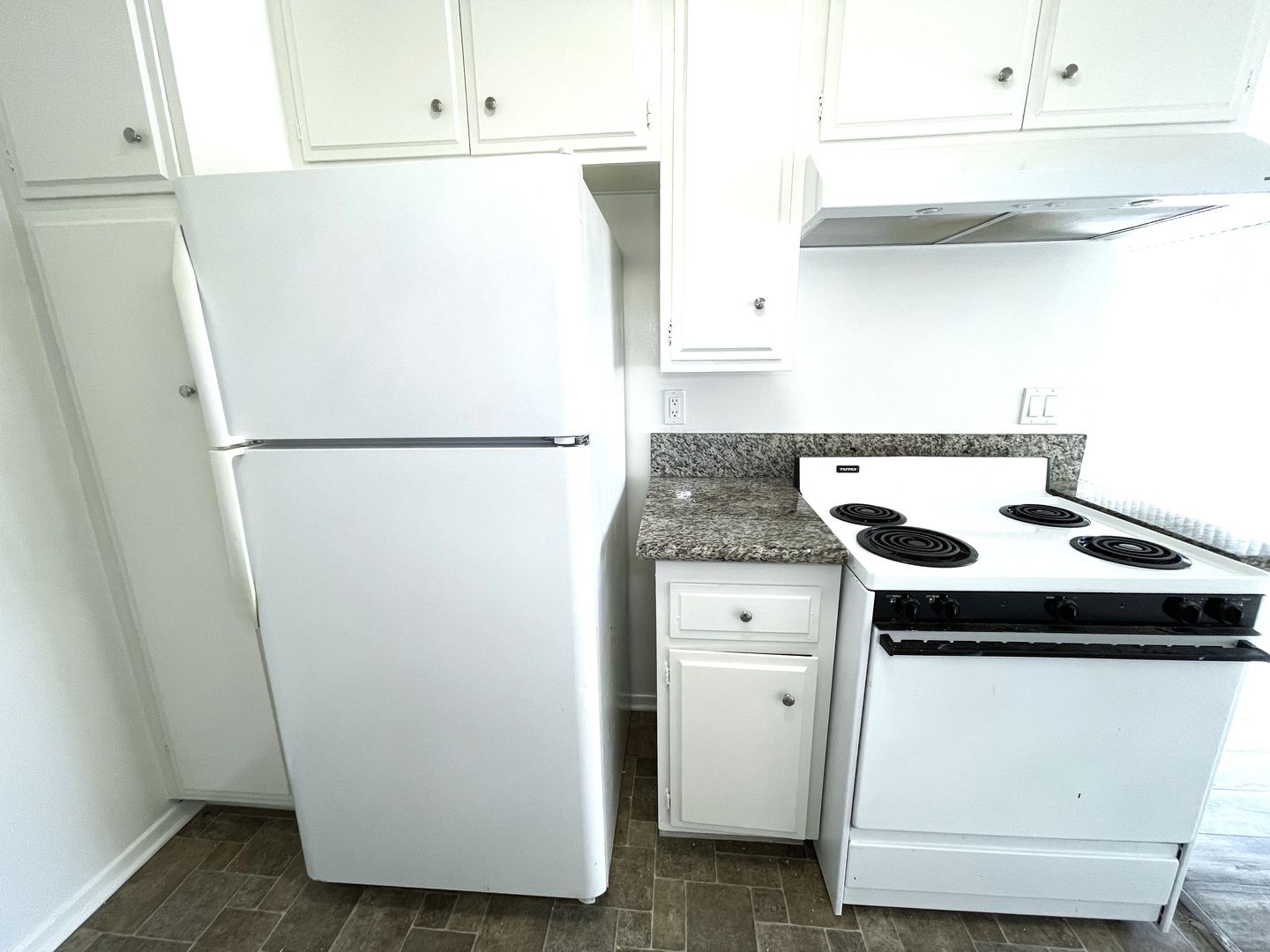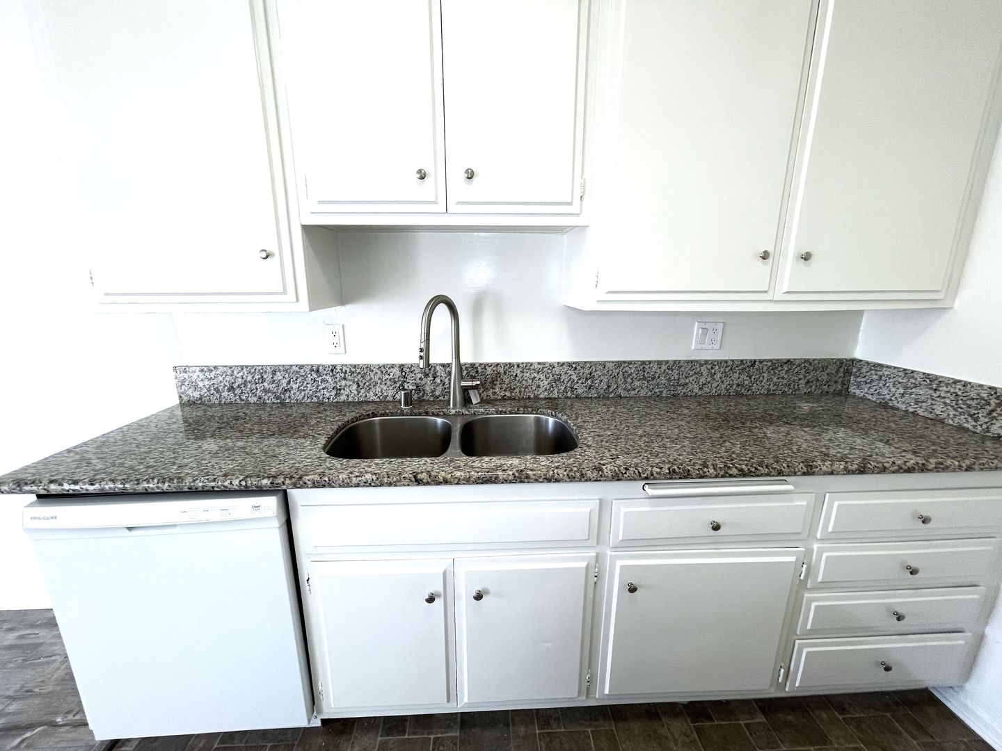 -- Updated kitchen features granite countertops, white cabinets, refrigerator, dishwasher, stove and oven