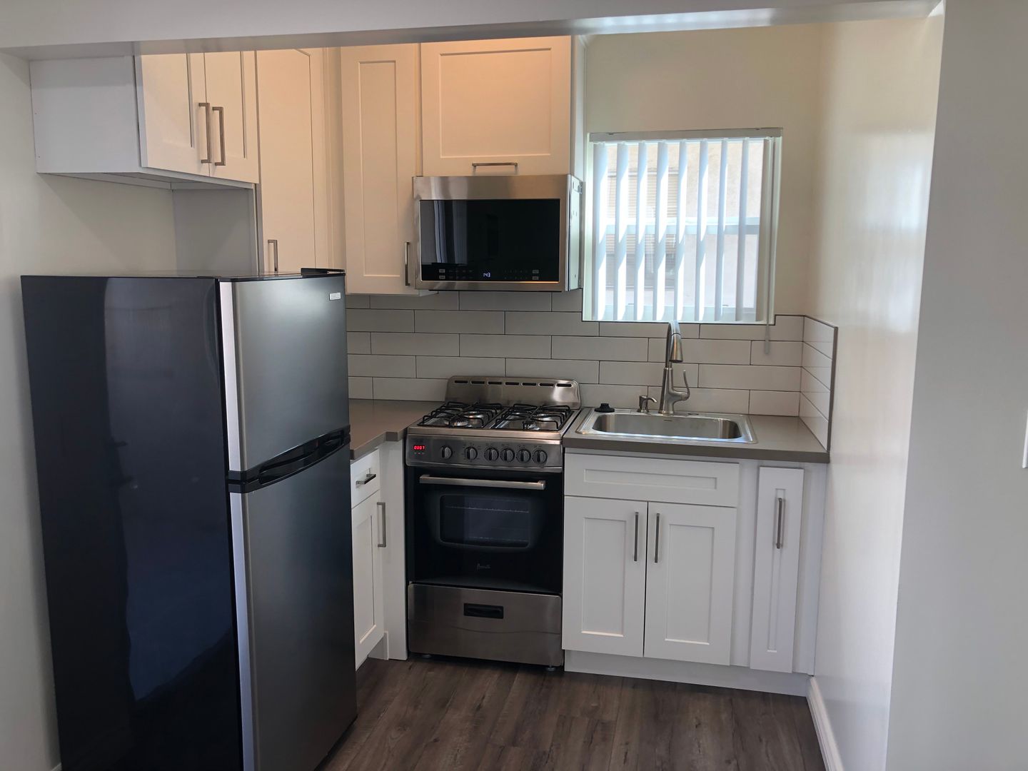 -- Remodeled kitchenette features gray quartz countertops, updated cabinets and stainless steel refrigerator, microwave and stove/oven