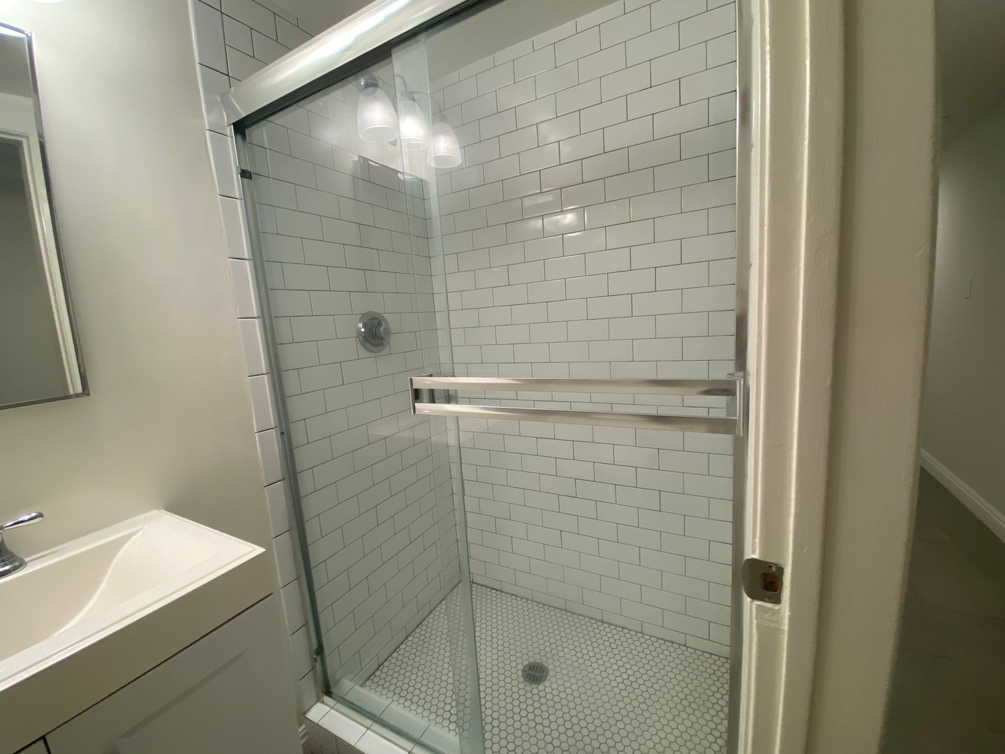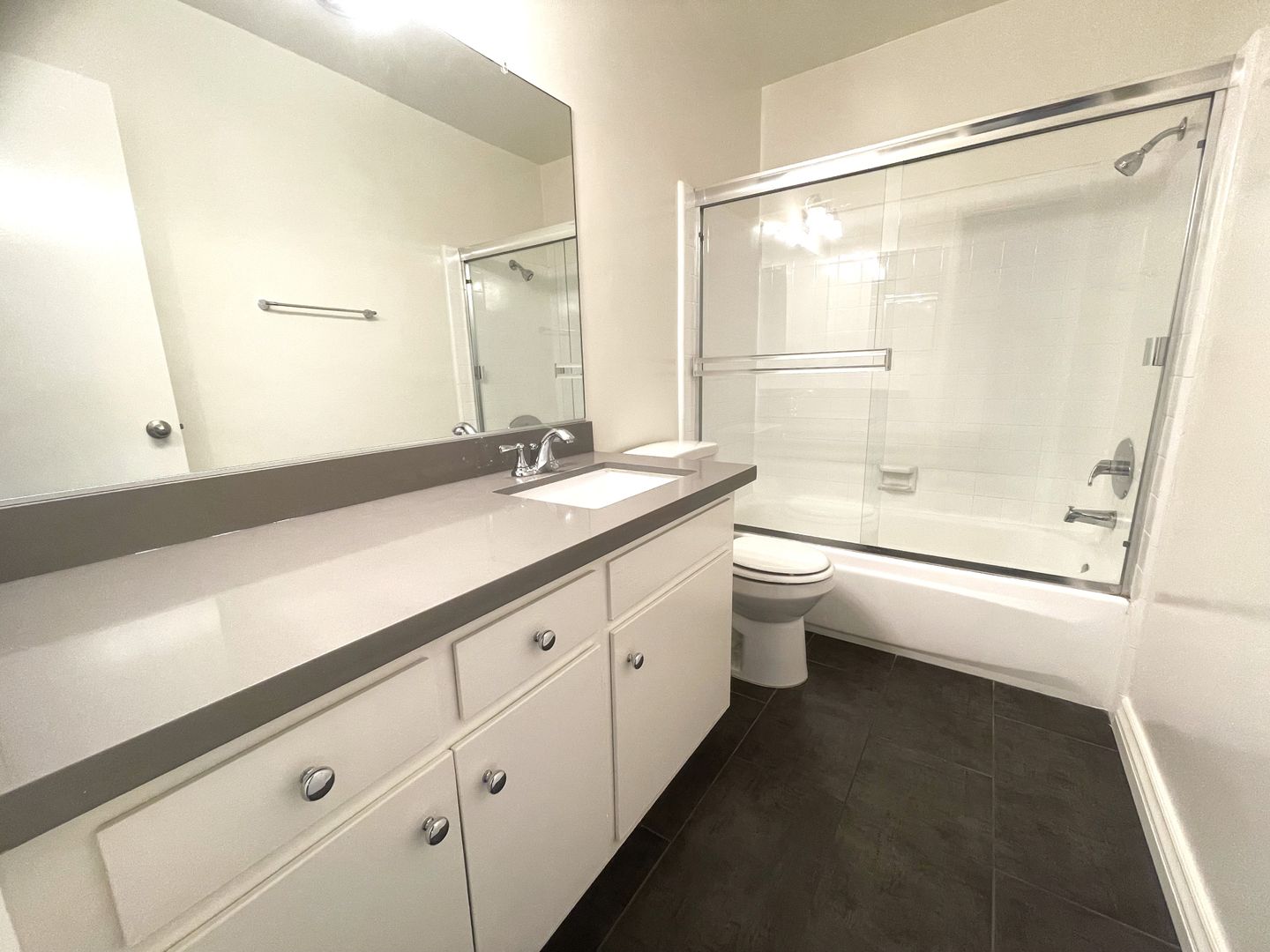 -- 2 Remodeled bathrooms on upper floor with modern tile flooring and tiled shower and bath, shower doors, quartz countertops