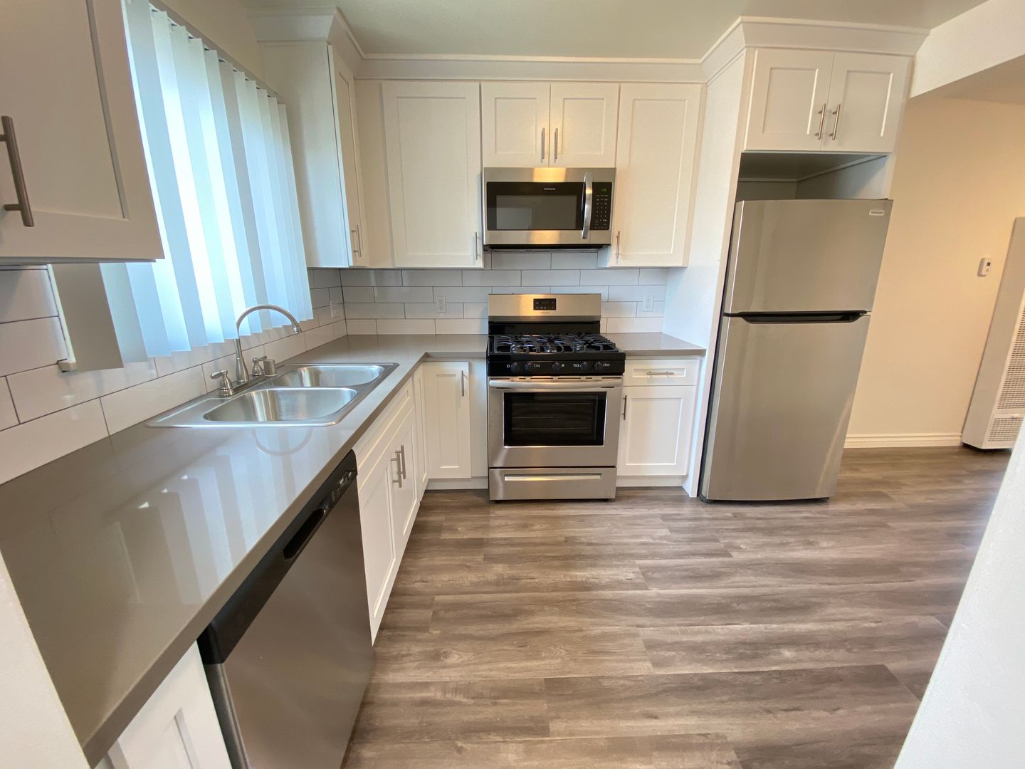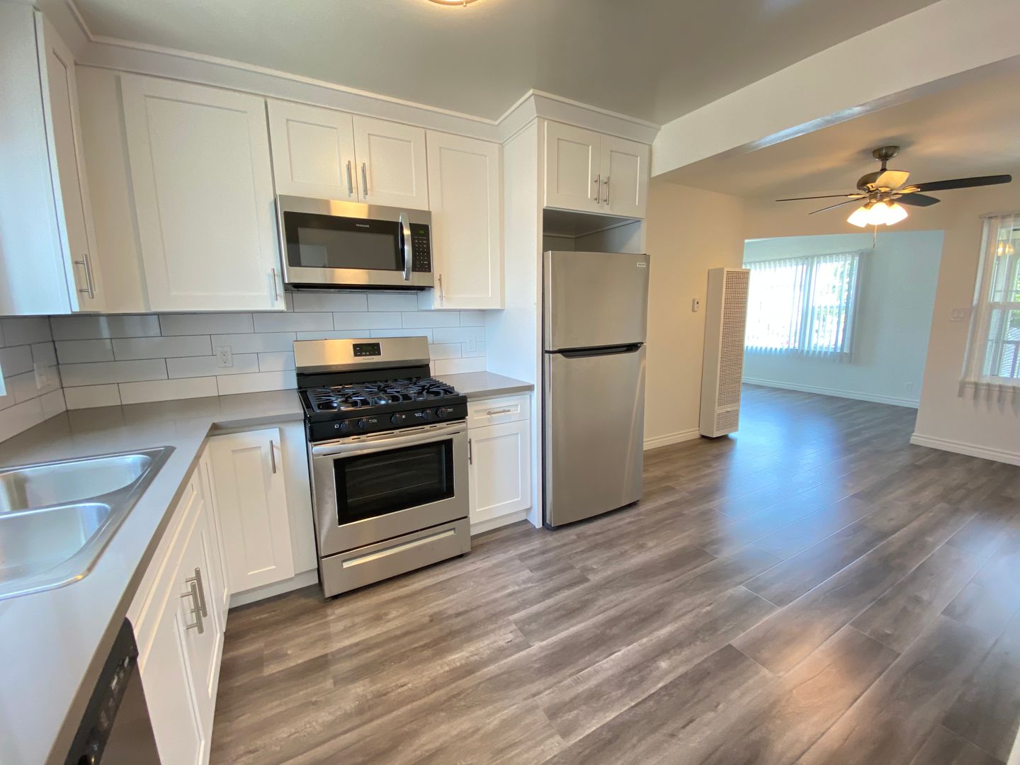 -- Remodeled kitchen features gray quartz countertops, matching designer backsplash, modern white cabinets, stainless steel appliances including refrigerator, stove and oven, dishwasher and built-in microwave, and stainless steel modern fixtures and door pulls on all cabinets