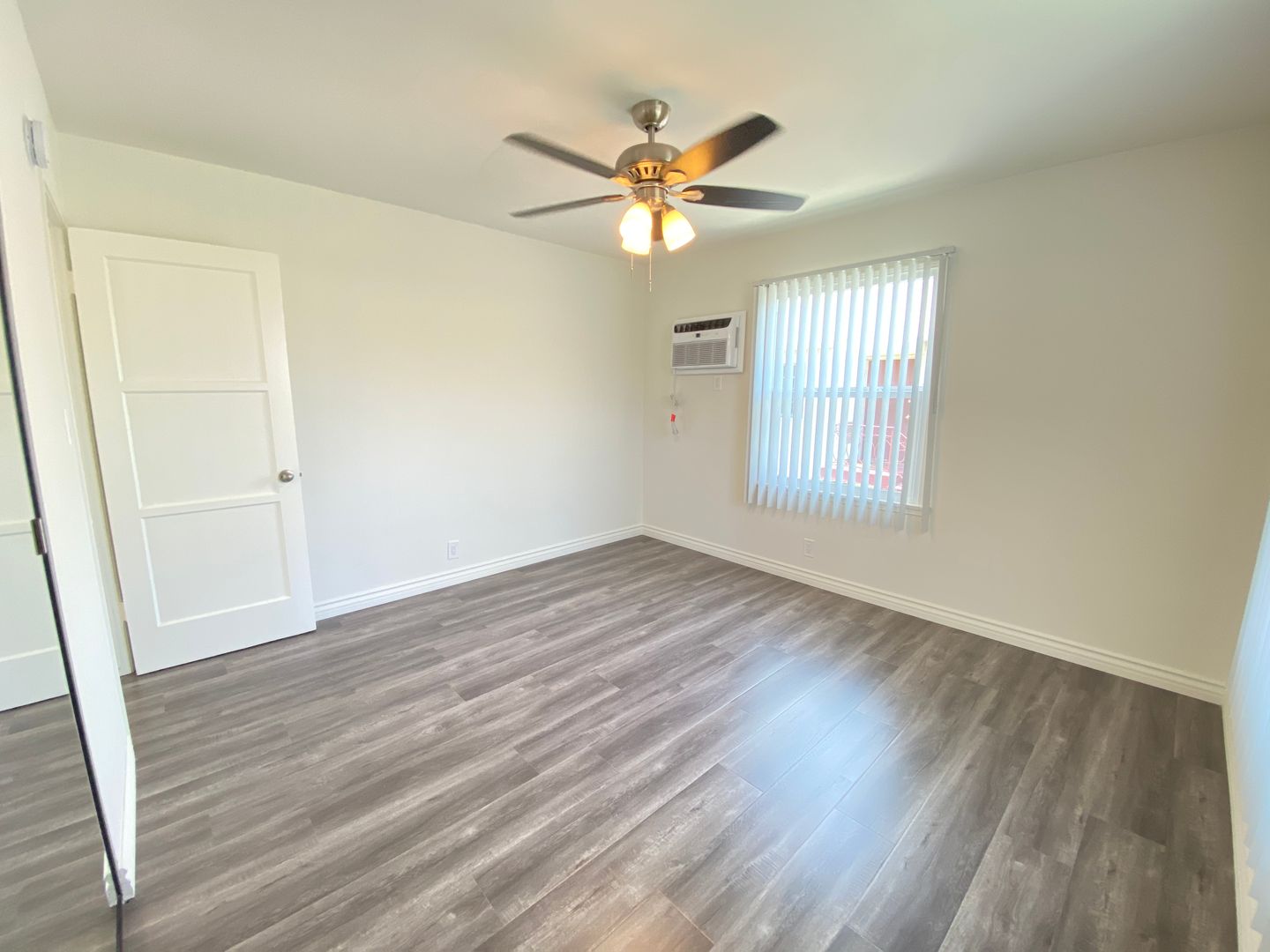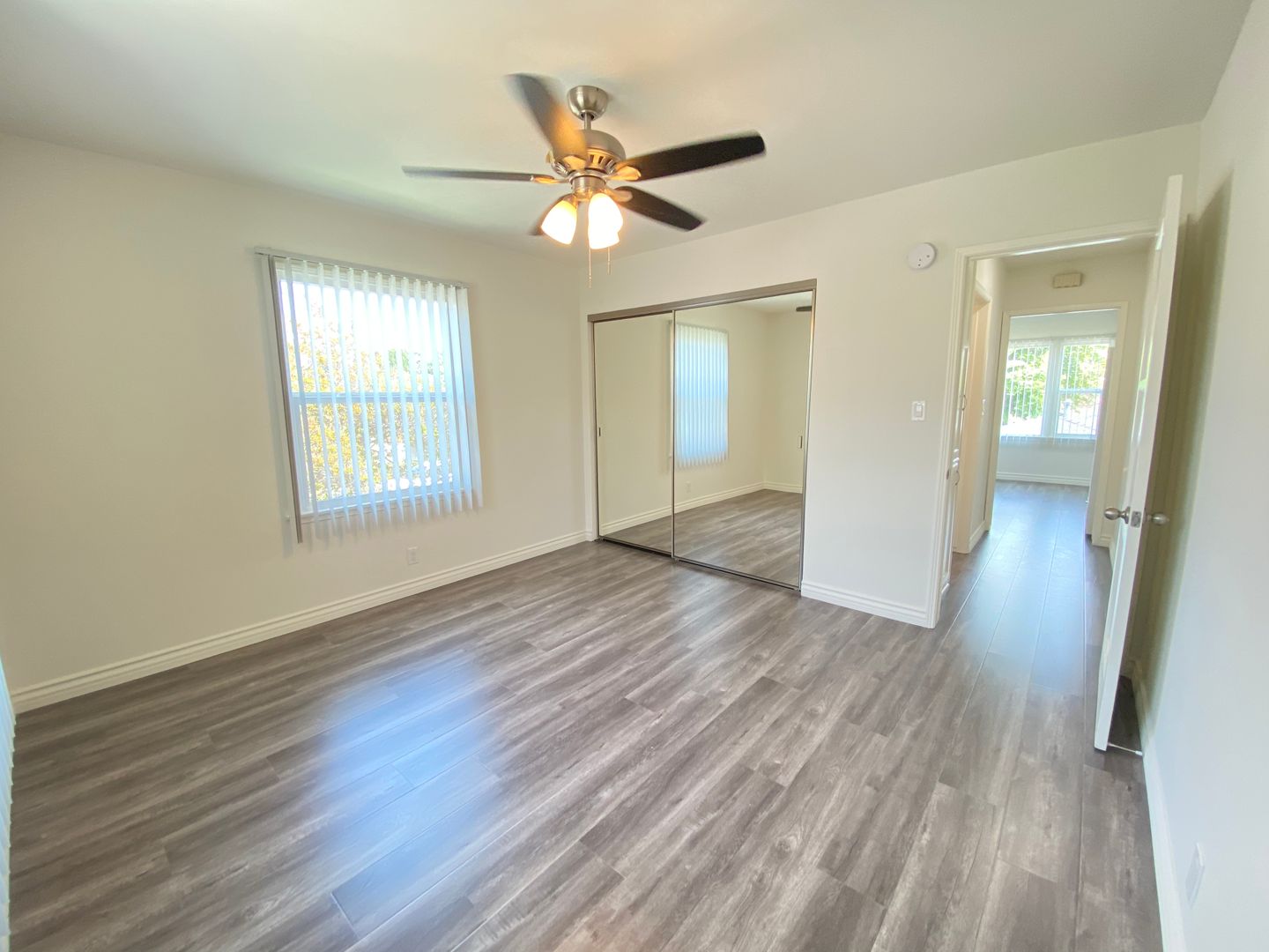 -- Bedroom with new mirrored closet doors and ceiling fan