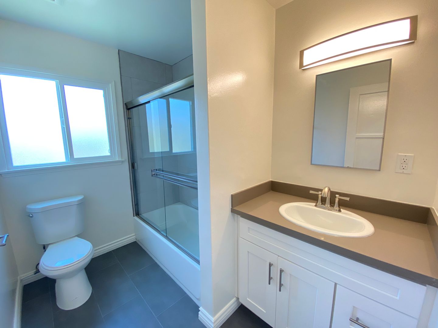 -- Remodeled bathroom with gray tile flooring and shower/bath, quartz countertops, updated white cabinetry and custom glass shower door