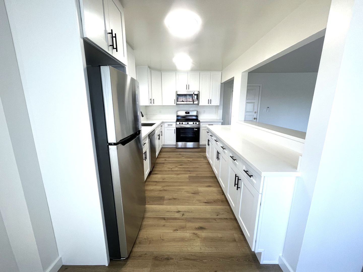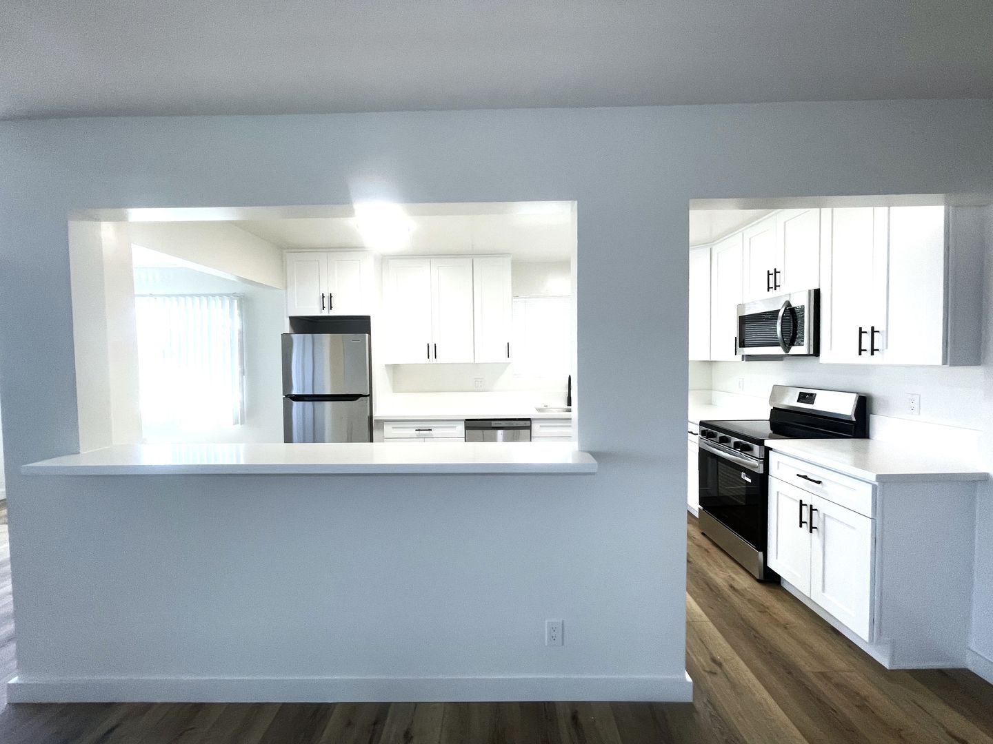 -- Remodeled kitchen features new stainless steel appliances (refrigerator, stove & oven, dishwasher, microwave), modern quartz countertops, lots of storage space, new cabinets