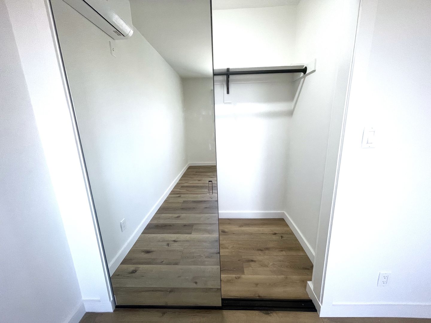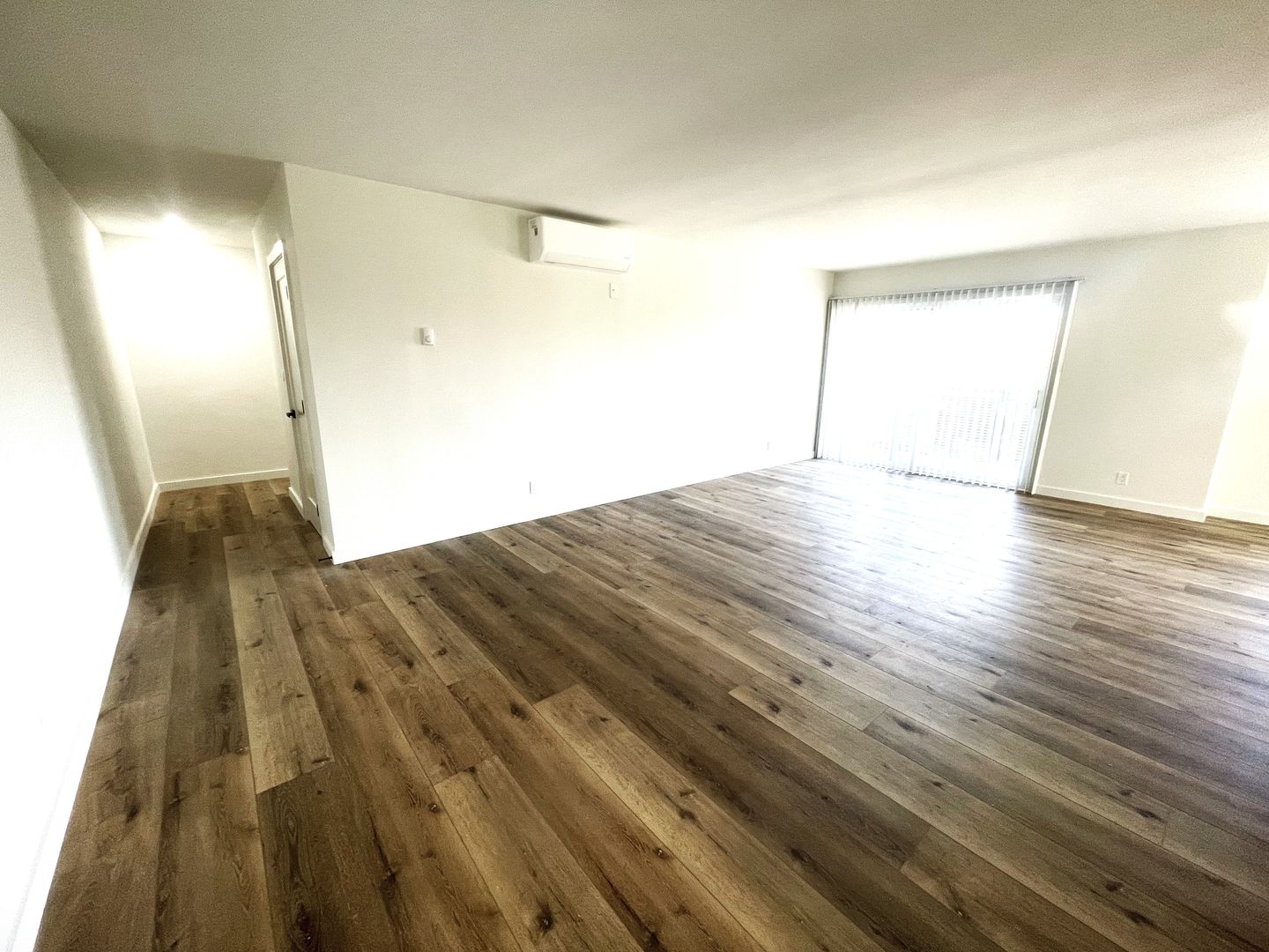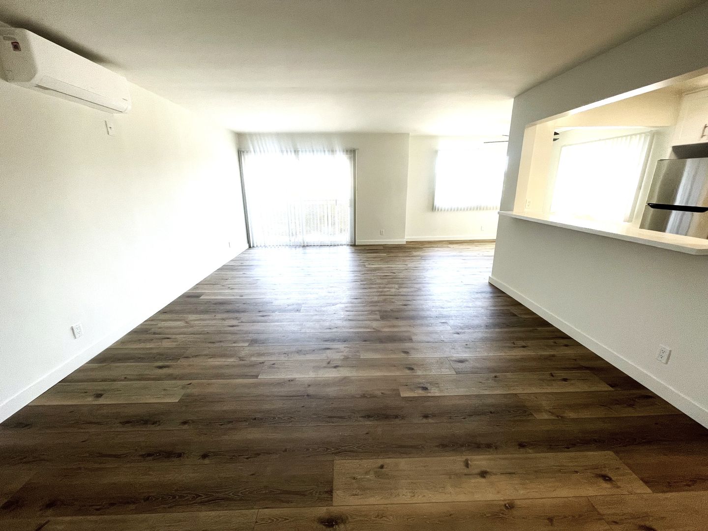 -- Living Room with new air conditioning unit and lots of light, balcony off of living room
